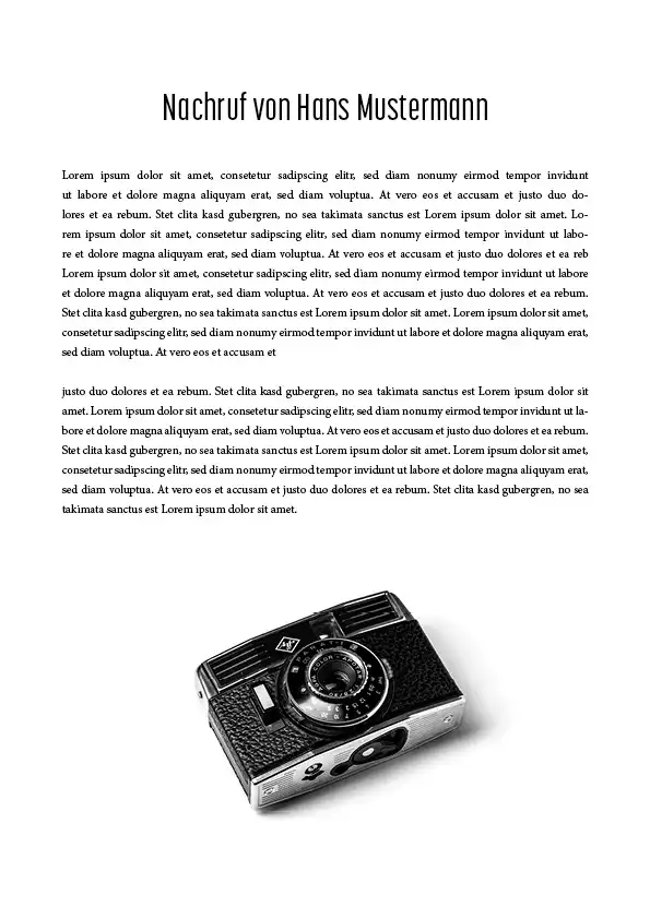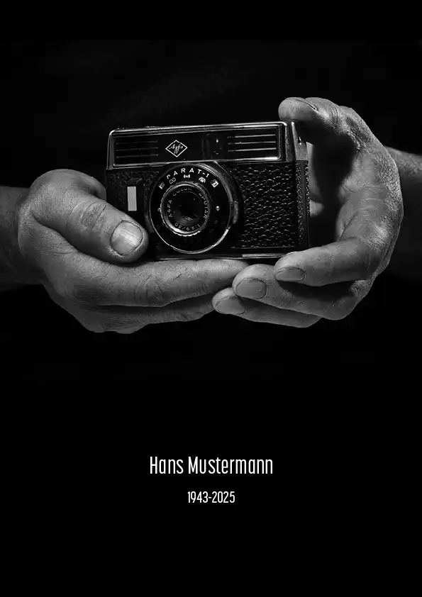 „Ihre Worte begleitend, möchte ich, seit über 25 Jahren professioneller Fotograf, ein ausdrucksstarkes Bild von Ihnen anfertigen. Im Zentrum stehen dabei Ihre Hän- de und ein persönlicher Gegenstand: Ein Objekt, das Ihnen im Leben wichtig ist oder ein Symbol, das sie an etwas oder jemanden erinnert. Dieser Gegenstand sollte nur so groß sein, dass er gut in Ihren Händen ge- halten werden kann. Im abgebildeten Beispiel sehen Sie meine erste Kamera, die mein Vater mir geschenkt